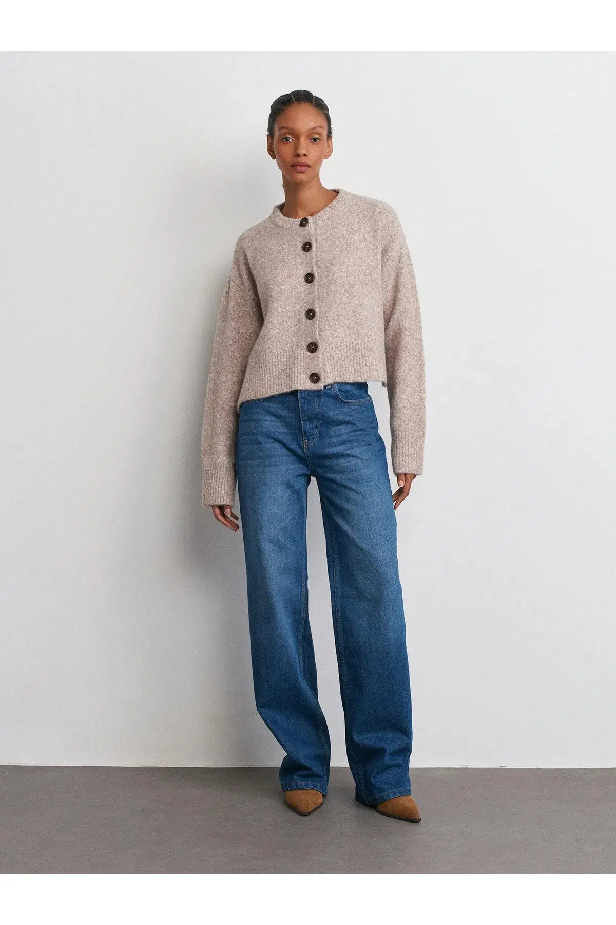 Dik Yaka Düğmeli Yumuşak Dokulu Yırtmaçlı Triko Hırka