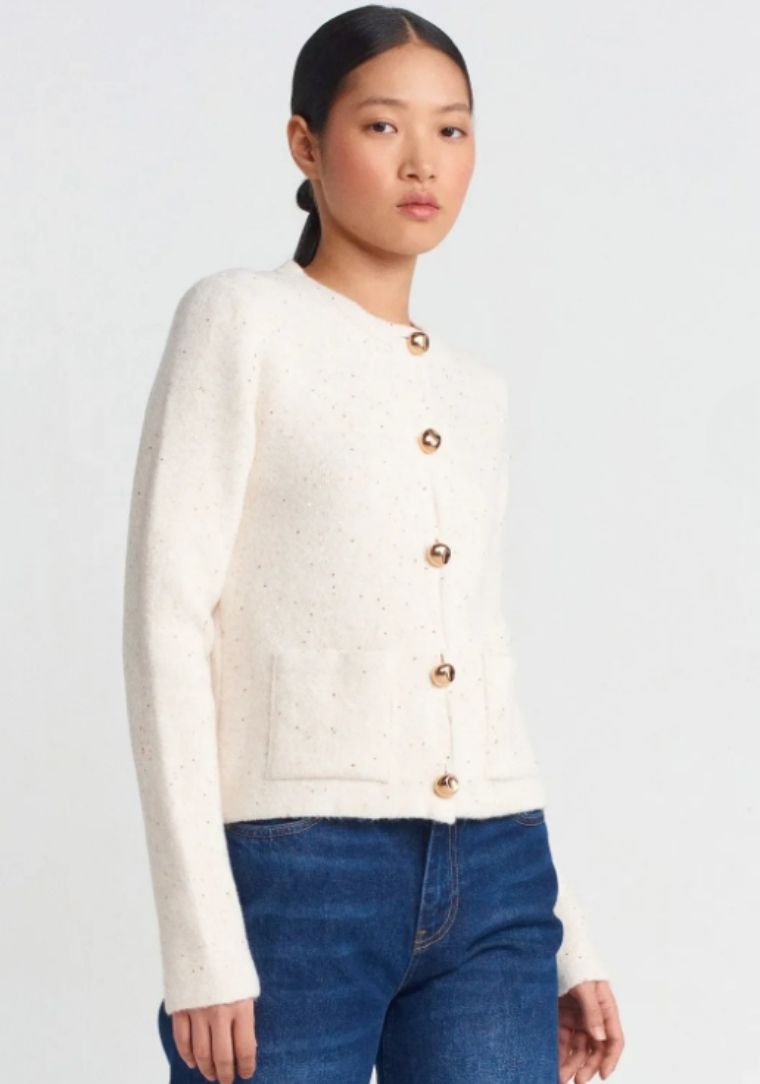 Bisiklet Yaka Pullu Simli Düğmeli Triko Hırka
