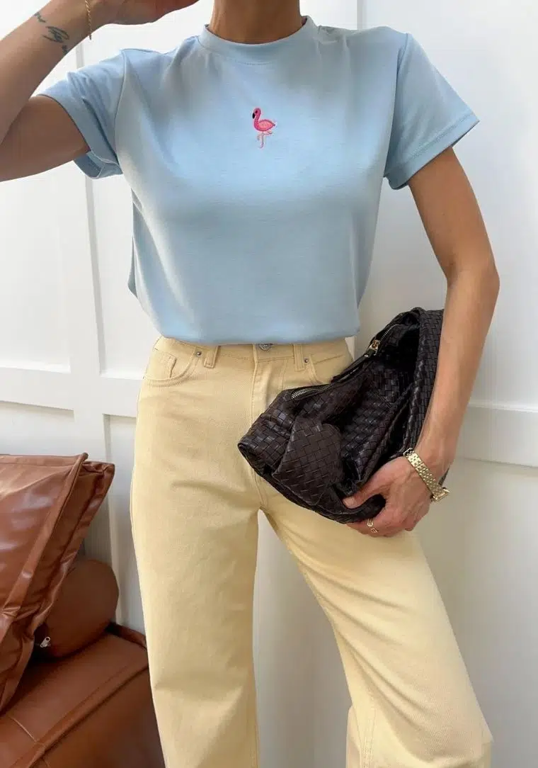 Tişört yaz aylarının şüphesiz ki en kullanışlı ve en rahat parçası. Flamingo Nakışlı Tshirt modelinin de dahil olduğu tshirt kategorisi capcanlı renkleri ve bazen de en basic görünümlerin yer aldığı bir katalog. Jean pantolonlar, şortlar ve etekler ile tamamlayabildiğimiz tshirt modelleri her sezon favorimiz olmaya devam ediyor.