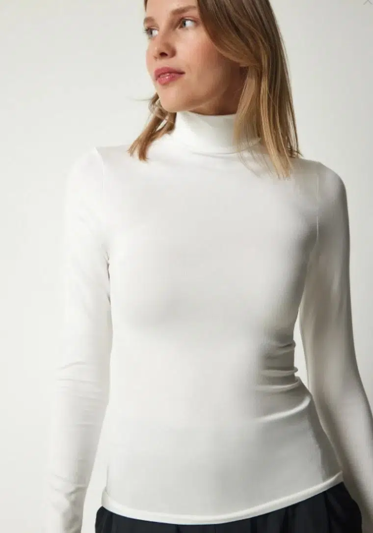 Rahat ve şık bir görünüm için ideal, ekru renkli dik yaka saran esnek örme bluz